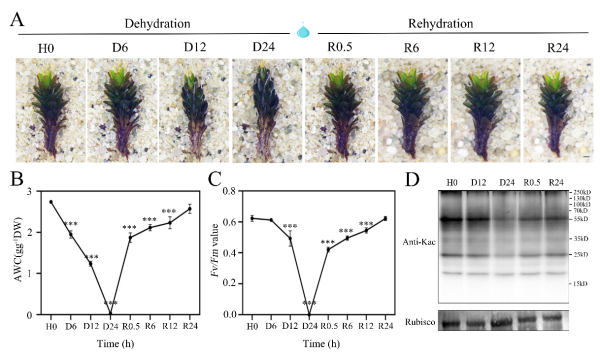 植物耐干性是自然界中极端逆境适应的重要现象。齿肋赤藓作为耐干研究的模式物种,能够在脱水超过98%的情况下仍保持生物活性。乙酰化作为一种重要的翻译后修饰机制,广泛参与植物抗逆应答,但其在极端耐干性中的作用机制尚不明确。