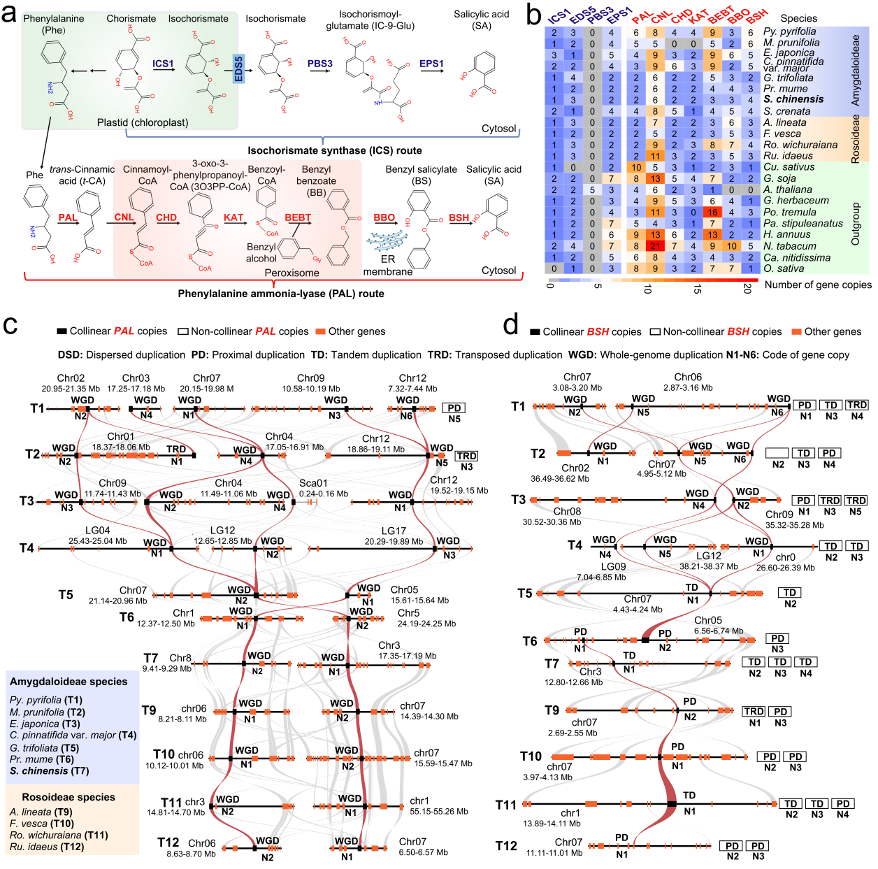 研究结果表明,PAL介导的途径是蔷薇科SA生物合成的主导路径,并在进化上高度保守。在李亚科物种中,该通路主要通过WGD扩张;而在蔷薇亚科中,则由WGD与小尺度复制(SSD)共同驱动。来源于WGD的基因普遍具有良好的共线性,并维持稳定高表达;而SSD来源的基因则表现出共线性降低和表达模式差异,反映出复制后的调控分化与亚功能化过程。