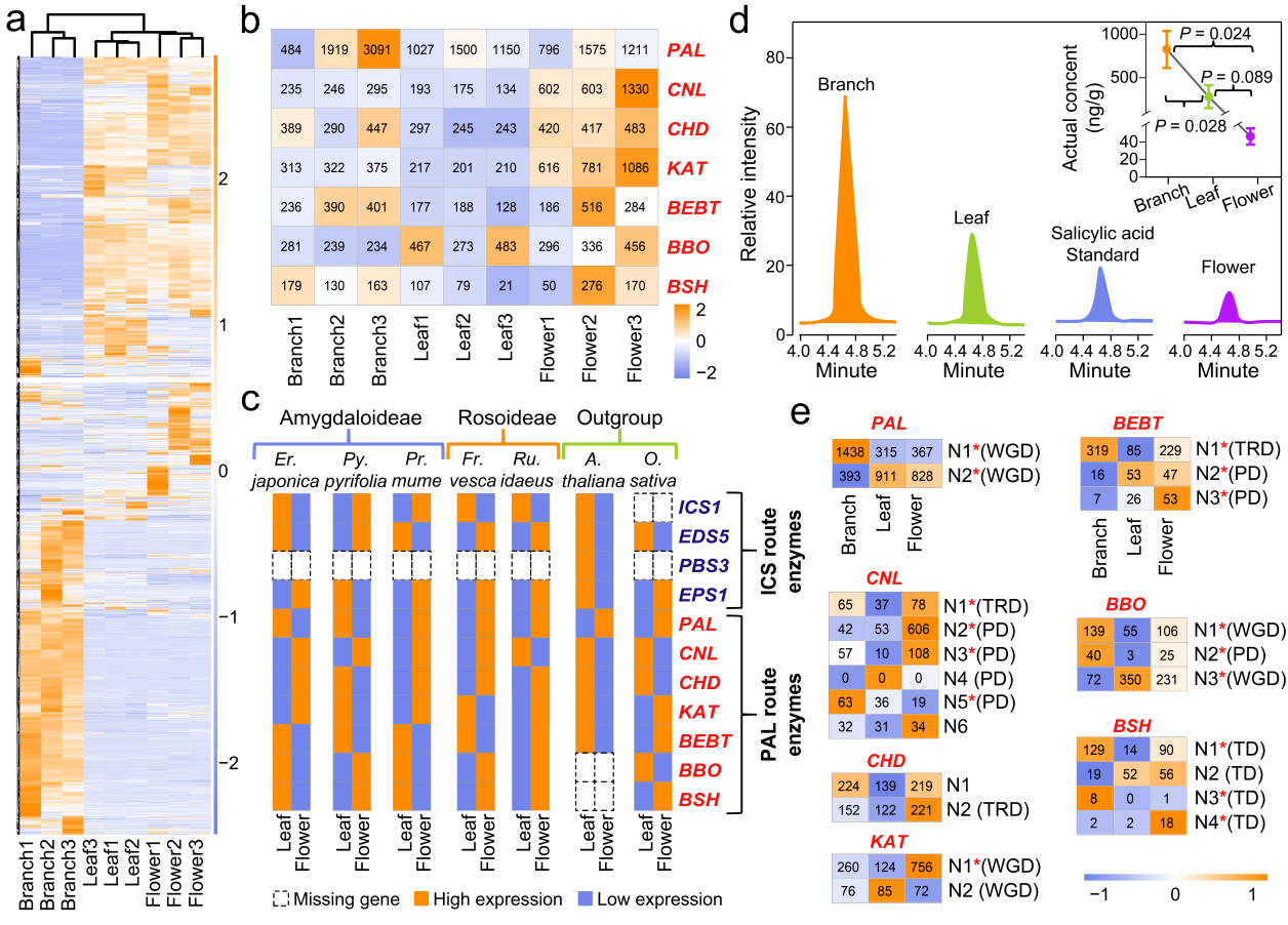 研究结果表明,基因组进化动态与转录及代谢调控的协同作用,共同驱动了SA生物合成通路的演化与功能分化,形成“核心稳定、外围灵活”的调控体系。该研究从基因组结构、基因复制、表达调控及代谢积累等多层面揭示了植物激素合成通路的演化机制,为理解植物免疫与环境适应提供了新视角,也为蔷薇科果树和观赏植物的抗病分子育种提供了重要理论依据。