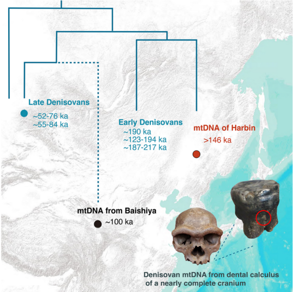 近乎完整头骨牙结石中的丹尼索瓦人线粒体DNA的演化图
