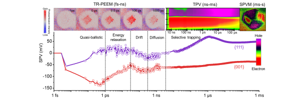 光催化过程中,光生电子和空穴需要从微纳米颗粒内部分离,并转移到催化剂的表面,从而启动化学反应。范峰滔介绍,在如此微小的物理尺度上,光催化剂往往缺乏分离电荷所需的驱动力,因此,实现高效的电荷分离需要一个有效的电场。为了在光催化剂颗粒中形成一个定向重排的电场,科研人员将一种特定的缺陷选择性地合成到颗粒的特定晶面,有效促进了电荷的分离。为了更好地剖析纳秒范围内高效电荷分离机制,科研人员使用了时间分辨光发射电子显微镜,发现了光生电子在亚皮秒时间尺度就可以选择性的转移到特定晶面区域,且电子在超快的时间尺度上可以从一个表面移动到另一个表面。