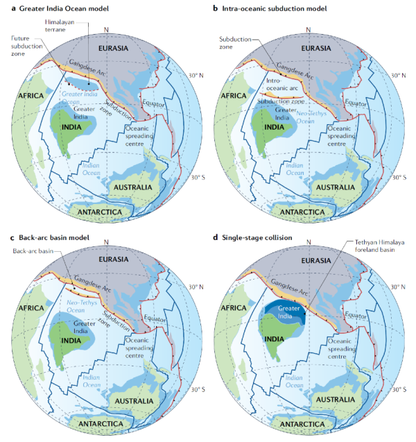 图1.印度-欧亚大陆初始碰撞模型。a、大印度洋盆模型,b、洋内俯冲模型,c、弧后盆地模型,d、单阶段俯冲碰撞模型。