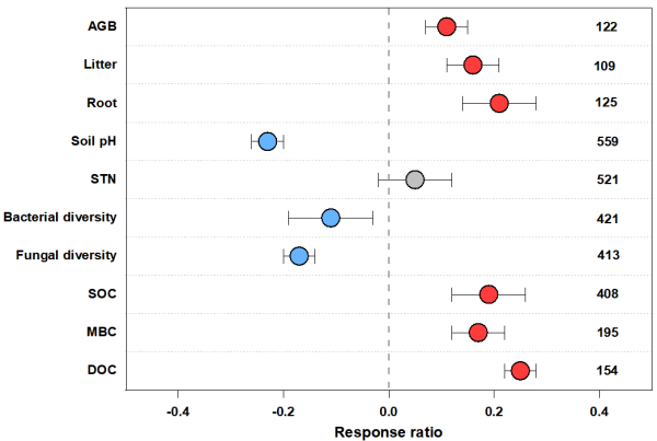 土壤微生物是陆地生态系统遗传多样性的重要组成部分,在陆地生态系统地下碳(C)循环中发挥重要作用。活性氮通过大气沉降的方式进入陆地生态系统,可有效缓解地上植被的氮限制,促进植物生长,增加植物生物量。然而,过多的氮素可能引起土壤pH下降,导致土壤养分失衡,破坏生态系统的稳定性。在土壤碳循环过程中,土壤微生物多样性与土壤有机碳紧密耦合;而这种耦合可能会被快速的全球氮沉降削弱或破坏。目前,对氮沉降如何影响土壤有机碳与土壤微生物有较多认知,但土壤有机碳和微生物多样性的关系如何响应氮沉降尚不清楚。