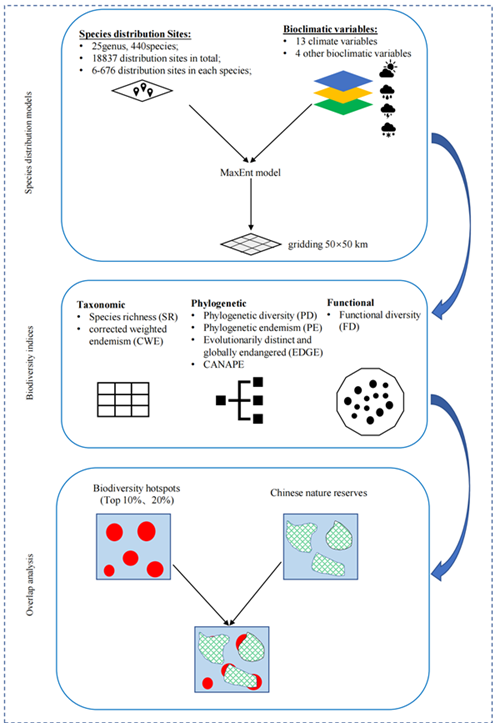 凯发k8西双版纳热带植物园植物系统发育与多样性保护研究团队以最大熵(MaxEnt)模型模拟当前樟科物种的潜在分布为数据基础,利用DNA条形码ITS构建286种中国樟科植物的系统发育关系,并收集了叶面积、株高等物种功能性状,从物种、进化和功能三方面分析樟科多维度的多样性空间分布格局。研究发现,中国樟科各多样性指标呈现出不完全一致的空间分布格局,形态特征的平行进化可能是造成功能多样性和其他指标不匹配的原因,多样性指数之间的脱钩突显了不同多样性的互补性以及它们各自在评估保护价值方面的作用;综合各多样性指标,提出了中国樟科植物重点保护区域位于西藏南部、横断山脉北部、云南南部和东南部以及秦岭和淮河南北分界的区域,而这些区域正是中国亚热带常绿阔叶林与北部的落叶森林、南部的热带森林、西部的高原植被形成的交错区域。该研究强调了综合多维度多样性指标、以实现最大限度保护中国常绿阔叶林生物多样性的重要性,证实并确立了森林交错带对生物多样性保护的重要价值。