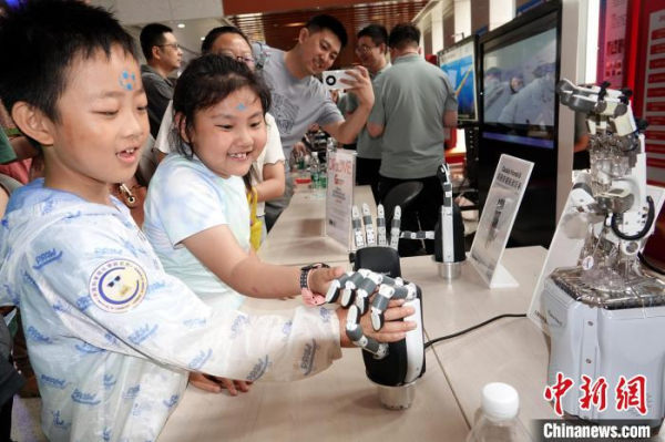 凯发k8自动化所公众凯发k8日活动上,青少年观众与仿人五指灵巧手“握手”。中新网记者 孙自法 摄