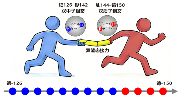 原来,这些异能态可分为两组:一组源于双中子组态,即两个中子耦合形成的结构,能量主要由中子携带;另一组源于双质子组态,即两个质子耦合形成的结构,能量主要由质子携带。它们仿佛接力赛中的两名选手,在钐-142与钆-144之间完成了一次完美的交接:中子组态毫不拖泥带水地转变为质子组态,将异能态的长寿命特性传递了下去。