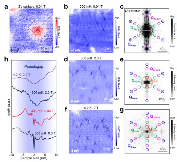 在300 mK施加垂直磁场以及4.2 K零磁场下观测到的配对密度波以及赝能隙
