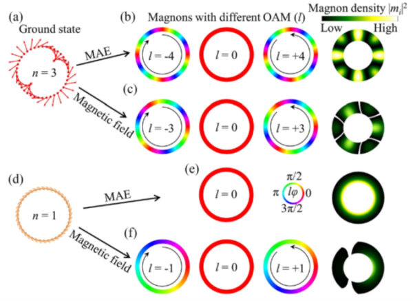 研究发现VSe2纳米管的基态为新的高阶3φ磁性涡旋态,能够形成八瓣状磁子密度分布图案,是准一维体系中新的稳定非共线拓扑有序态;揭示铁磁与反铁磁交换作用及磁各向异性的竞争机制,可稳定不同缠绕数的磁性涡旋态,或为设计弯曲磁体中复杂自旋织构提供普遍原则;发现不同轨道角动量磁子模的杂化现象,为产生与调控高轨道角动量磁子提供了新途径。