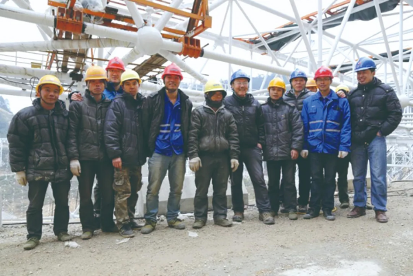 索网合龙当天,南仁东、姜鹏与现场工人拍了合影。没有鲜花,没有仪式,大家却笑得开心极了,因为这标志着“中国天眼”渡过了建设阶段最困难的一关。