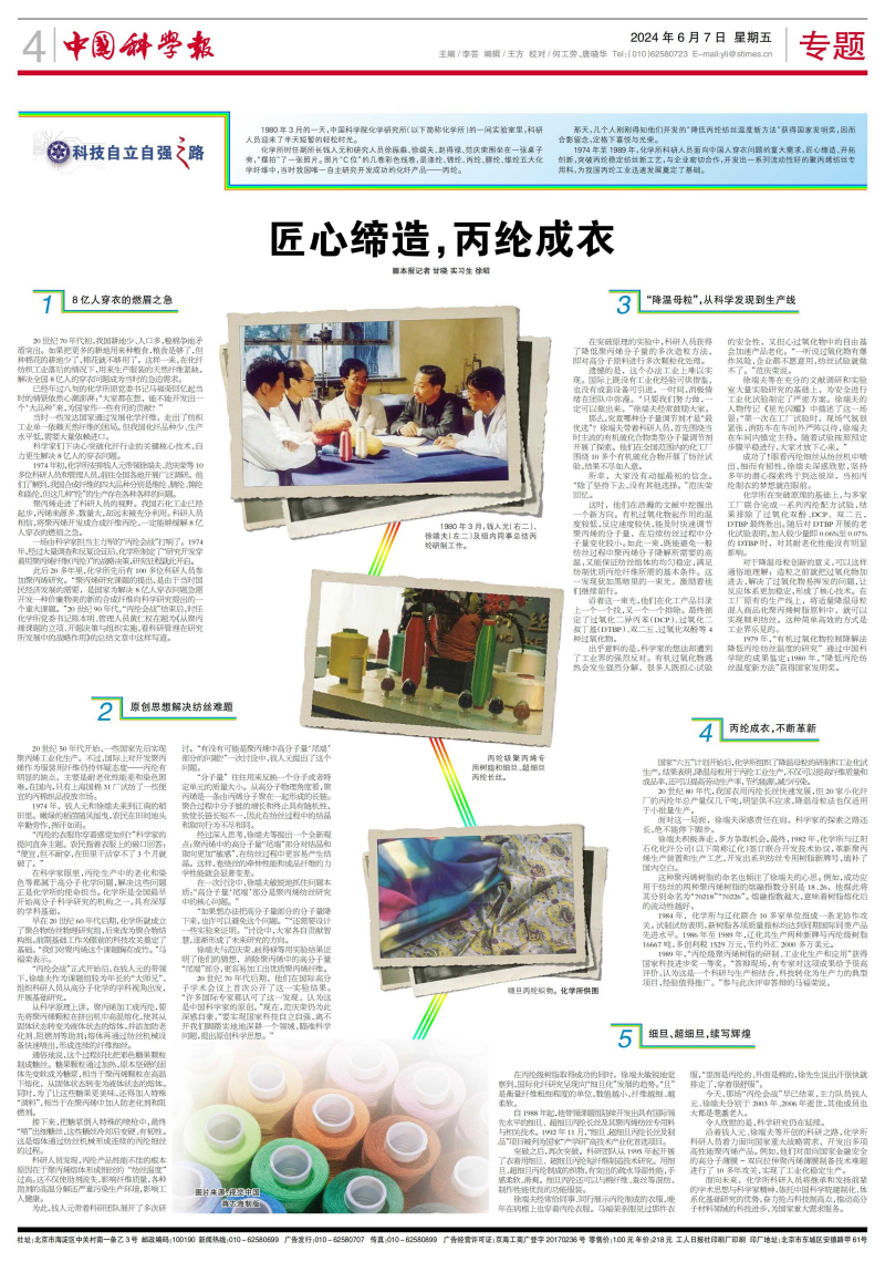 1974年至1989年,化学所科研人员面向中国人穿衣问题的重大需求,匠心缔造、开拓创新,突破丙纶稳定纺丝新工艺,与企业密切合作,开发出一系列流动性好的聚丙烯纺丝专用料,为我国丙纶工业迅速发展奠定了基础。