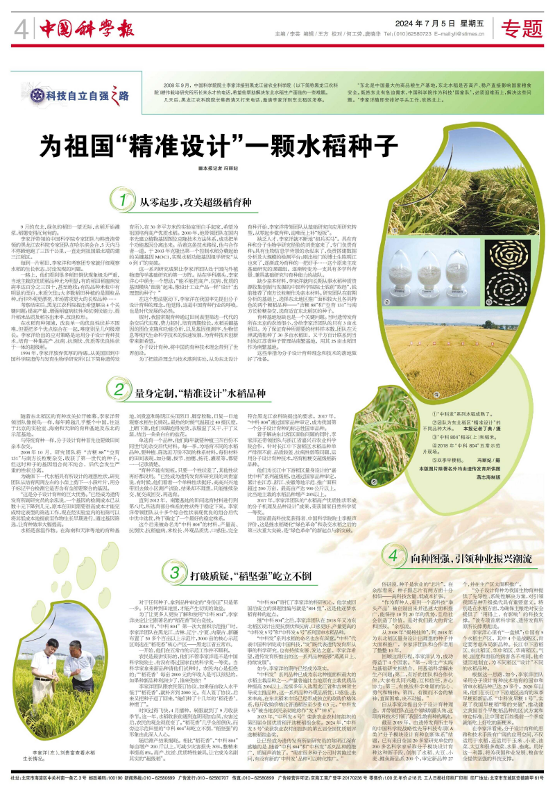 根据这一思路,如今,李家洋团队采用分子设计育种技术培育的国审和省审水稻品种已达20多个。2020年以来,他们在长江中下游地区选育的双季早粳稻新品系“中科发早粳1号”,实现了我国早粳稻“零的突破”,推动建立我国首个早粳稻品种的区试方案和审定标准,让中国老百姓提前一个季度就能吃上好吃的新粳米。