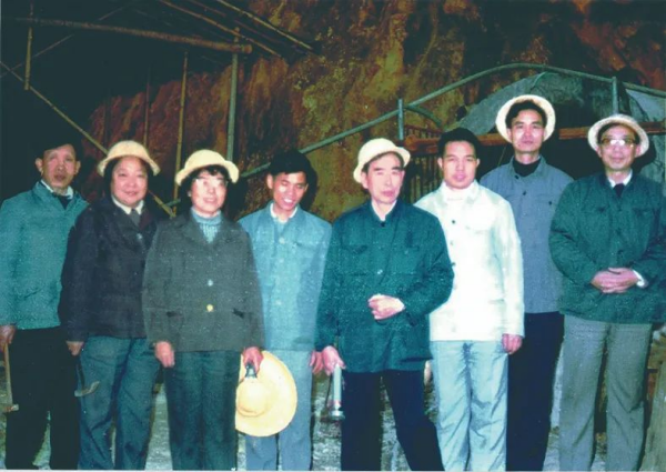 1986年,涂光炽(左五)等人考察广东省高要金矿。