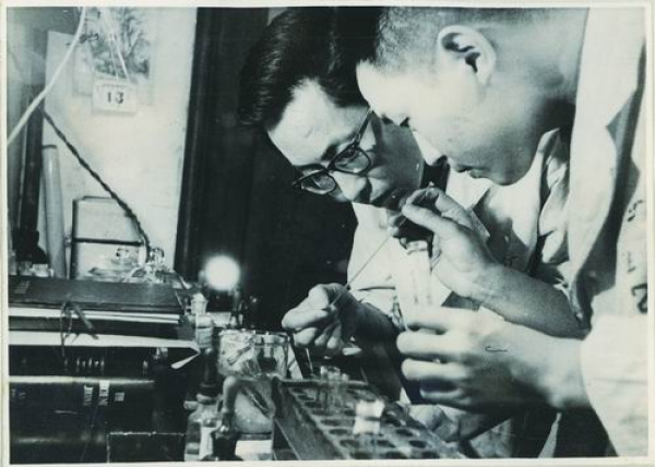 生化所龚岳亭(左)、蒋荣庆观察人工合成牛胰岛素B链和天然牛胰岛素A链重组半合成胰岛素的结果。