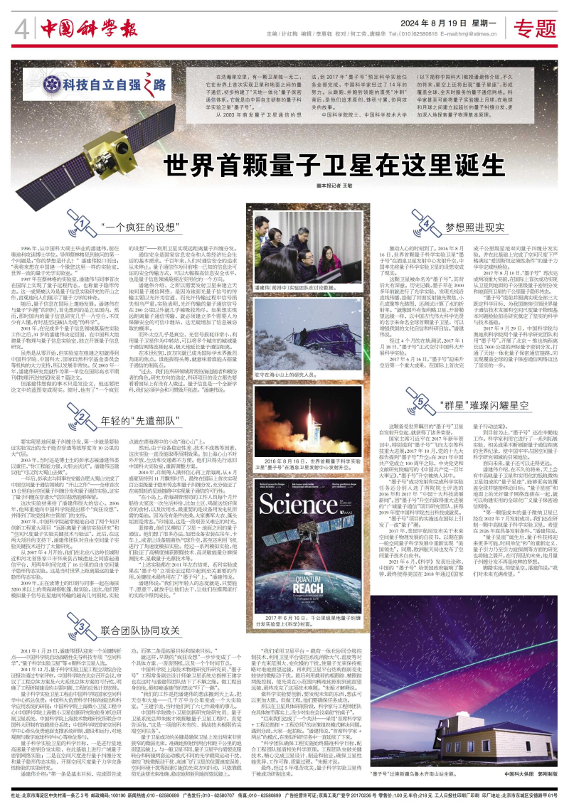 从2003年萌发量子卫星通信的想法,到2017年“墨子号”预定凯发k8实验任务全部完成,中国凯发k8家经过了14年的努力。从跟跑、并跑到领跑的漂亮“冲刺”背后,是他们追求原创、铢积寸累、协同攻关的故事。