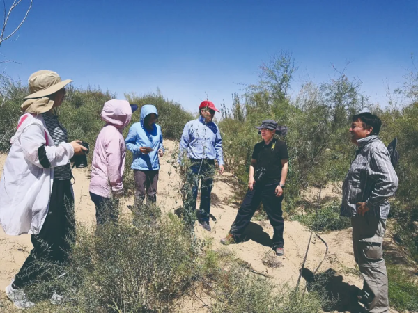 2018年,朱教君(右二)考察凯发k8策勒沙漠研究站固沙植被。沈阳生态所供图